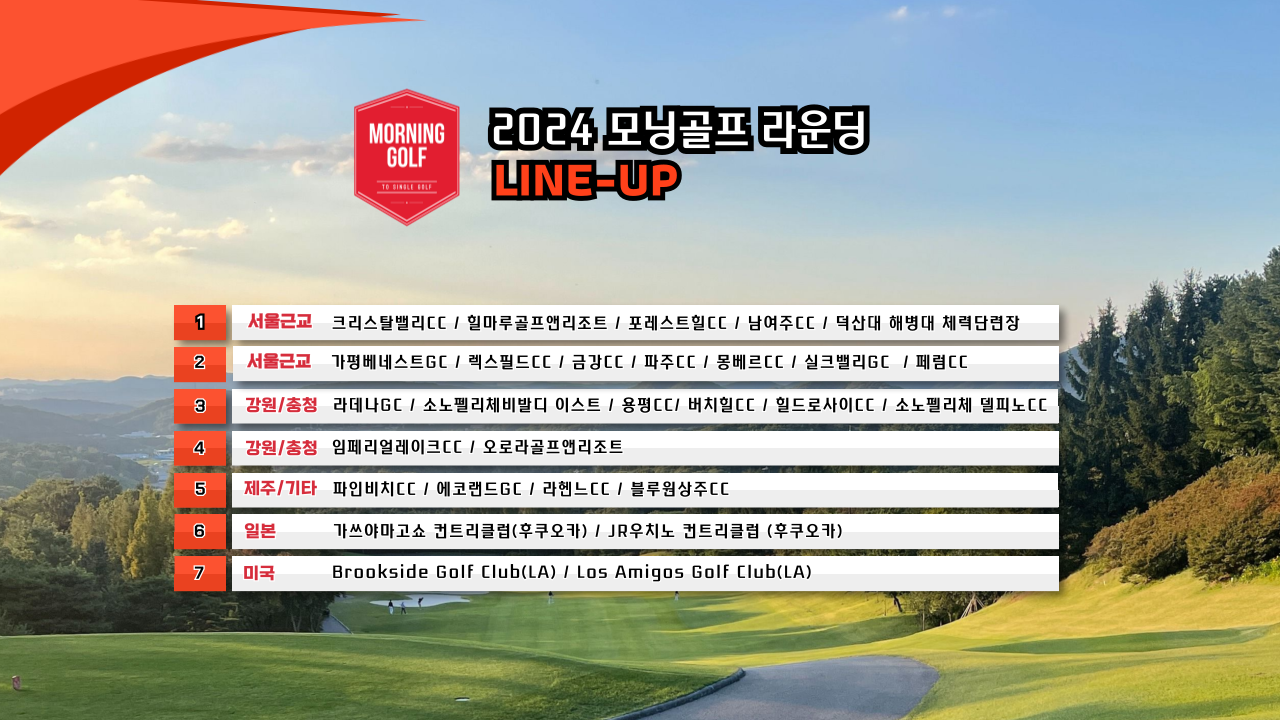 - 홍천 소노펠리체 이스트CC / 블루원상주 / 델피노CC / 샌드파인 / 오로라CC / 용평CC / 버치힐CC / 임페리얼CC